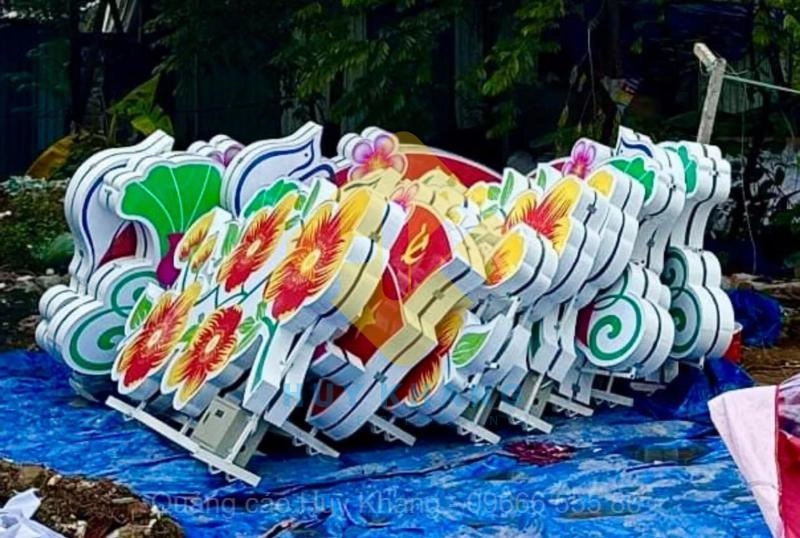 - Các icon và biểu tượng được làm dạng khối hộp 3D gắn lên cổng chào nhằm gây ấn tượng và tạo điểm nhấn.