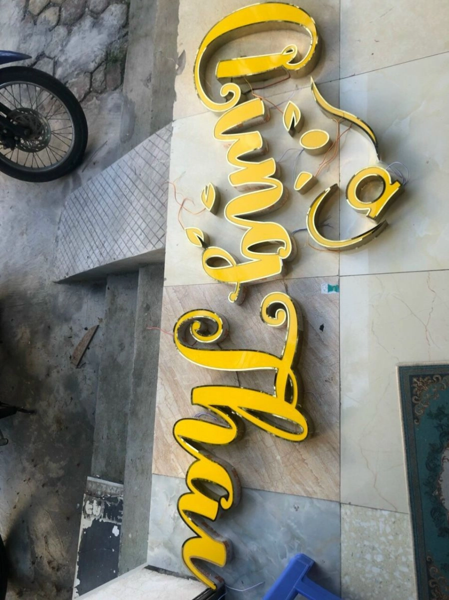 Cắt và chế tạo: Sau khi có thiết kế và vật liệu, tiến hành cắt và chế tạo các thành phần của biển hiệu. Điều này bao gồm cắt và gia công các tấm vật liệu, làm chữ nổi hoặc chữ cắt, và tạo ra các thành phần khác như hộp đèn LED.